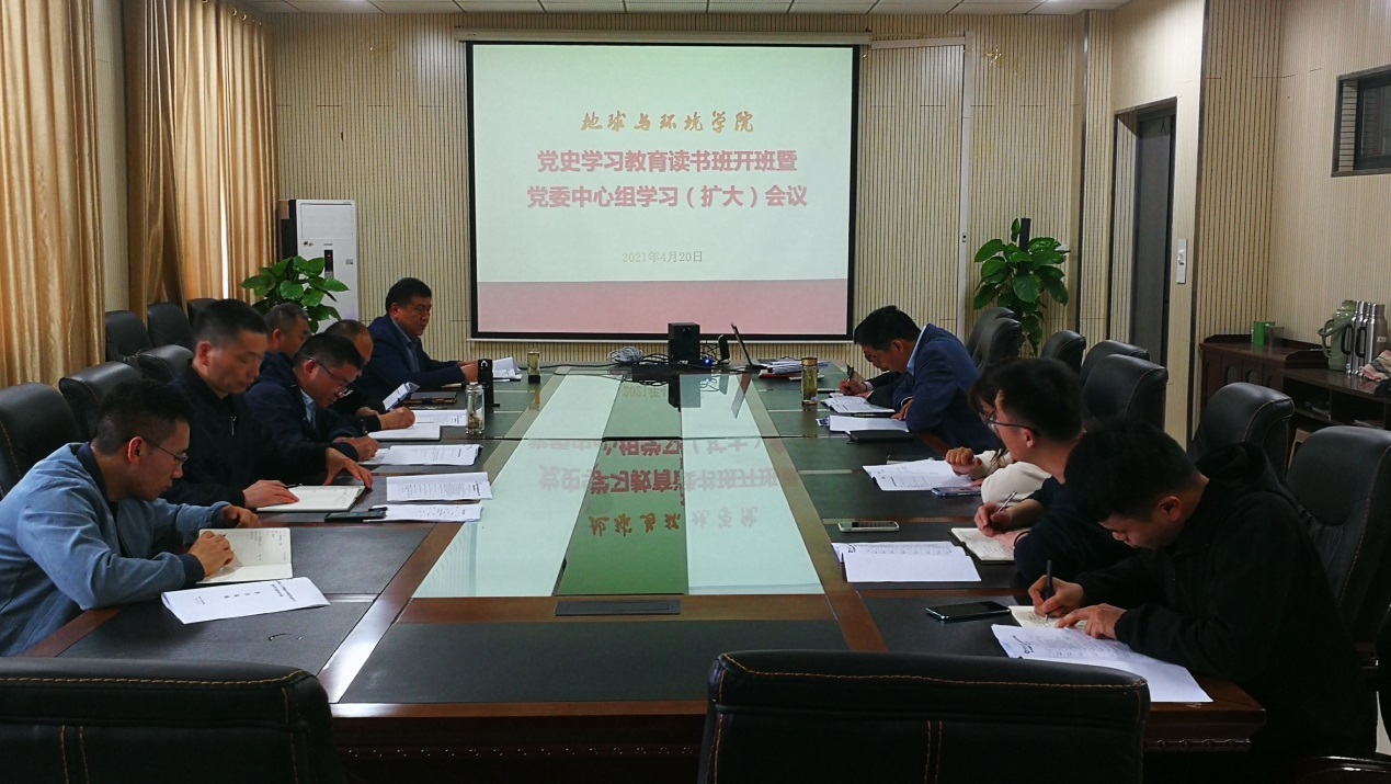 4月20日下午,地球与环境学院在静远楼B414举行党史学习教育读书班开班式暨党委理论学习中心组(扩大)学习会议。会议由党委副书记、执行院长刘启蒙主持,学院领导班子成员、党委委员、党支部书记、科级干部和全体辅导员参加。