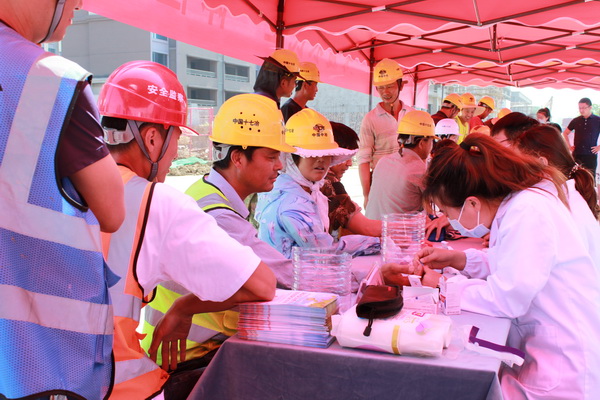 在“安理家园”西门前,党员师生们发挥专业优势,为一线施工人员量血压、测血糖,并就内科、外科、皮肤科、五官科等方面的健康咨询,仔细进行义诊义检,有针对性地提供治疗建议和健康科普宣传。为应对夏季高温天气下作业的需要,还向施工人员免费发放了清凉油、风油精、酒精、创可贴、碘伏、眼药水等防暑降温和外伤消毒用品,结合实际为群众办实事、办好事。活动现场近百名施工人员参与了此次医疗便民服务。
