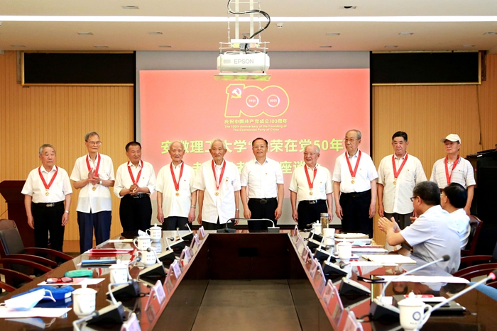 在中国共产党百年华诞临近之际,6月22日下午,学校在舜耕苑二楼会议室召开“光荣在党50年”老党员老干部座谈会。校党委书记郭永存出席会议并讲话,他强调,要深入学习贯彻习近平总书记关于党史特别是关于教育的重要论述,以老党员老干部为榜样,发扬红色传统,传承红色基因,赓续共产党人的精神血脉,为加快“双一流”创建作出新的更大贡献。党委副书记、常务副校长虞宝桃主持会议,党委常委、副校长董雨和党委常委、纪委书记、监察专员周旭参加会议。